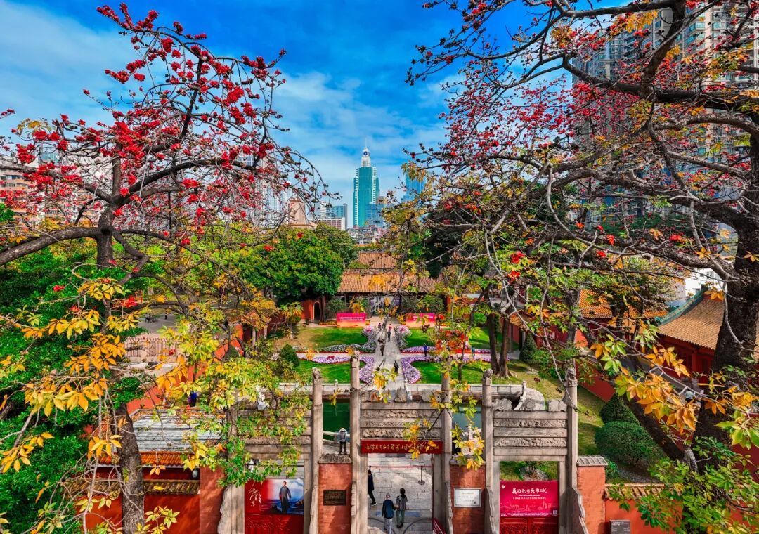 每当木棉盛放时,花苞在高空铺撒出一片绵延的鲜红锦绣,如梦似幻。位于越秀的中山纪念堂、烈士陵园、海珠广场、越秀公园、农讲所等都是欣赏红棉的最佳体验点,满树繁花吸引游人驻足拍照。