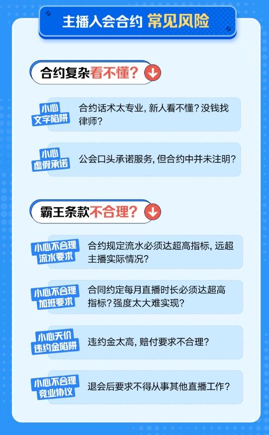 据了解,“合约风险AI检测”工具重点针对主播签约直播机构时面临的四大高频风险场景,进行辅助检测,包括:直播机构设置不合理高额违约金;自行定义“有效直播时长”,导致直播机构任意曲解、判定主播未完成工作要求;直播机构要求不合理直播时长,导致主播高强度工作;直播机构设置不合理竞业协议,导致主播退会后无法正常从事其它直播工作。
